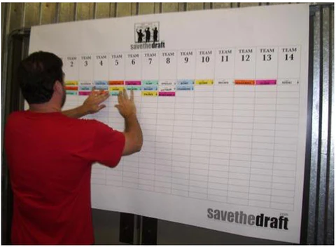 Ahhhhh, yes. To fold or to roll – that is the question. There is an easy answer: Rolling a draft board creates size limitations, and we are not willing to concede the critical aspect of sheer size to roll our boards. The very purpose of a fantasy football draft board is to represent NFL player labels that have to be identified by a group of people that are 10-20 feet away. In this scenario, bigger is truly better – it is as simple as that. Moreover – as beautiful and necessary as the draft board is in all her 80-pound stock glory – it is a disposable item. At the end of the night, it is taken down and used as the reference for the entry of the league’s team rosters. And while the draft boards do seem to linger around in offices, playrooms and garages long after they have served their purpose at draft night, ultimately they are thrown away.